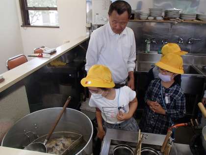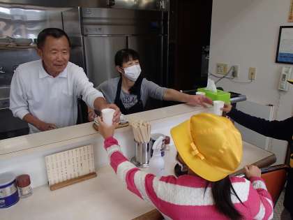 お店の中で、スープのだしをつくっている大きな鍋を見せていただき、3種類のスープを味見させてもらいました。「おいしい!」「あつあつ!」ととってもうれしそうな子供たちでした。たくさんの質問にも答えていただきました。なんばんラーメンさん、ありがとうございました!