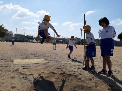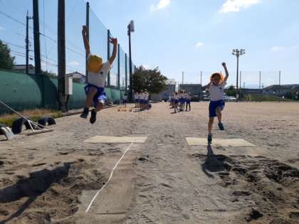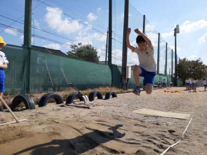 体育科の学習で走り幅跳びに挑戦しています。跳ぶときのポイントを意識して練習しています。