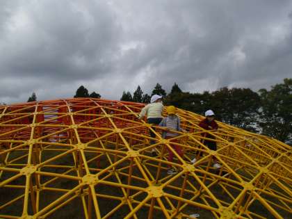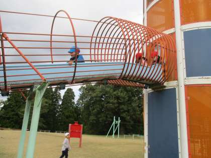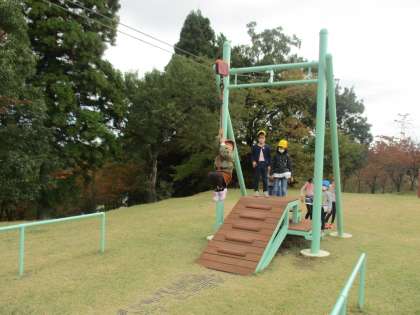 わんぱくの丘では、ターザンロープやアスレチック等の遊具で遊びました。順番を守って利用したり、譲り合って仲良く遊ぶことができました。また、広い芝生広場で、思い切り走ったり鬼ごっこもでき、時間いっぱい楽しむことができました。
