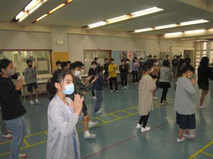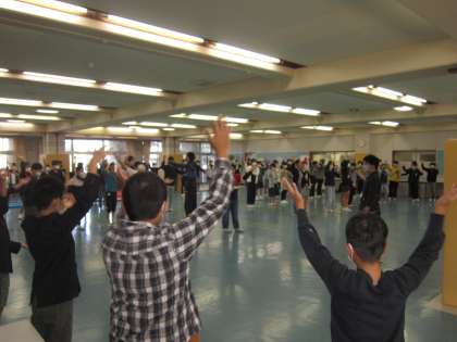 今日は、朝から青空でした。さんさい踊り発表会を数時間後に控え、子供たちは、最後の踊りの振付チェックをしました。