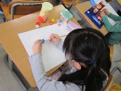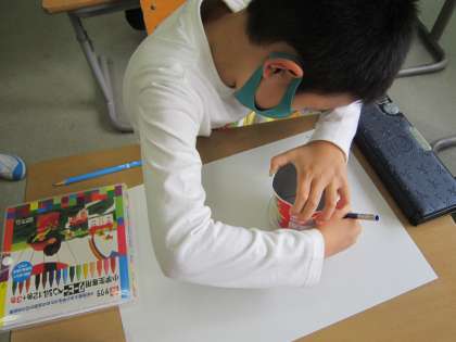 箱をしっかり押さえて形を写し取ることは、なかなか難しいのですが、子どもたちは、箱の面を見て次々とアイディアが浮かんだり、友達のかいている絵を見て刺激を受けたりして、電車やロボット、恐竜やお花などを描いていました。