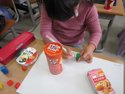 いろいろな形の箱で遊びながら形に親しむ学習の最後に、箱から形を紙に書き写して絵を描いて楽しみました。