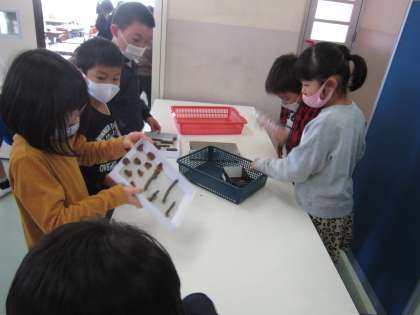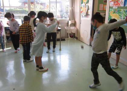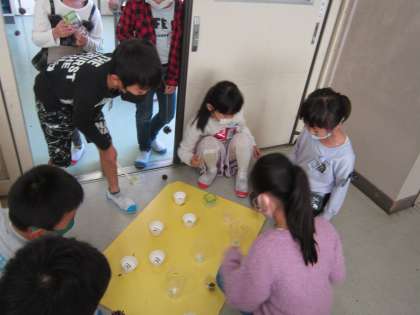 秋の木の実のおもちゃで遊びました。担任がつくったおもちゃを紹介すると、大喜び。遊んだ後には、「楽しかったから、自分でもつくってみたいな。もっと増やしてみんなで遊びたいな。ほかのおもちゃもつくれないかな。」の声。来週は、自分でつくって楽しもうね。