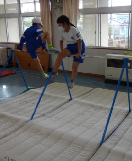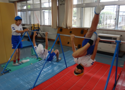 体育科の一場面です。 軽運動室で鉄棒の練習に励む5年生です。