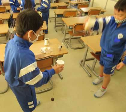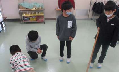できたおもちゃを、友達と一緒に遊んで試しています。