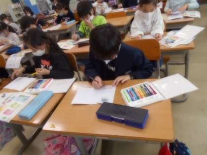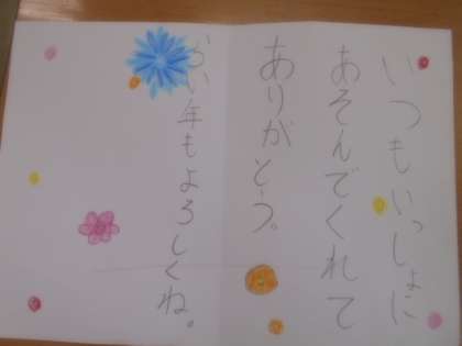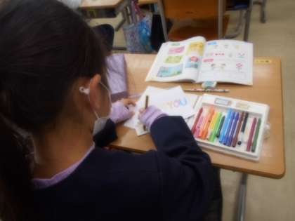 今日は、日頃の思いを大切な人に伝えるためにメッセージカードを贈るという外国の習慣に習い、友達に贈るメッセージカードを作りました。クリスマスカードやサンクスカード、ニューイヤーカード等、それぞれの思いを込めたカードを書くことができました。