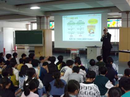 外部講師の方をお招きし、防災ワークショップを開催しました。水害や地震等の自然災害が起こった際の被害の様子や対策等について、クイズを交えながら教えていただきました。子供たちは、楽しく学習しながら防災意識を高めていました。