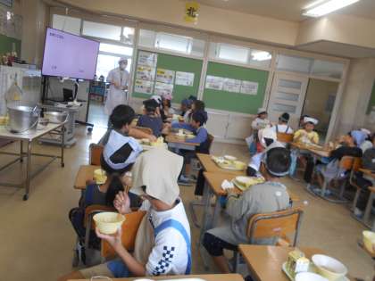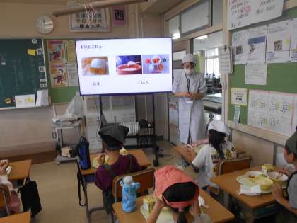 給食の時間に、栄養士の先生からお米についての話を聞きました。米とご飯の違いやお米に含まれている栄養について知ることができました。子供たちは、「お話を聞いたからか、いつもよりお米がおいしく感じる」と、いつも以上にお米を味わって食べていました。