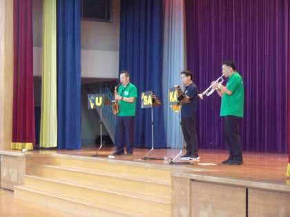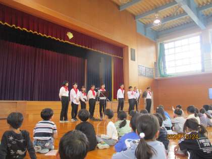 先日の学習発表会では、保護者に見守られて児童ががんばりました。今日は、全校児童に見守られて教職員ががんばりました。体育館に、温かい時間が流れました。