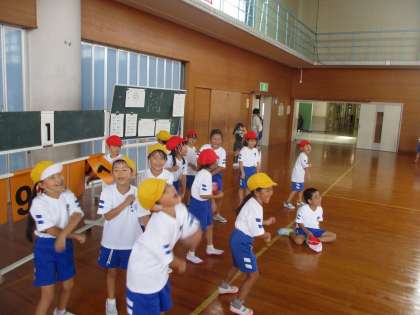 体育科の学習では、色団ごとのチームに分かれてドッジボールをしています。パスとキャッチの練習を繰り返していると、だんだんボールを受けられるようになってきました。ゲーム中は、仲間を応援する声が体育館に響き渡っています。