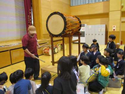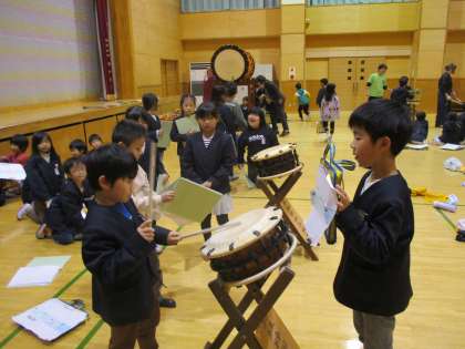 演奏後には、地域の方から太鼓の打ち方を教えていただき、音楽の授業でくったリズムを一人一人演奏してみました。子供たちは、自分が叩いてみたい太鼓を選び、楽しく何度も音を響かせていました。