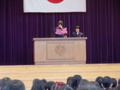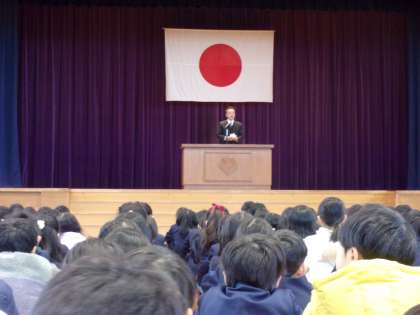1年生代表児童が、「給食を食べきることを2学期がんばった」と話しました。その話を聞いて、他の児童も「3学期は自分も何か目当てを決めて、ずっと目当てに向かってがんばりたい」と話していました。