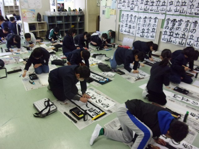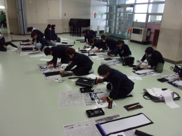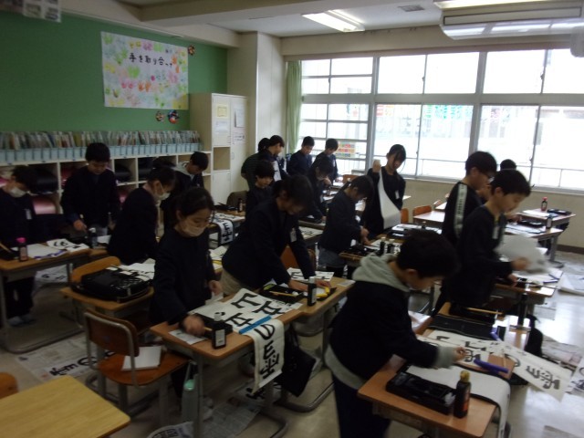 書き初め大会を行いました。一人一人が練習の成果を発揮しようと集中し、静かな雰囲気の中で取り組むことができました。