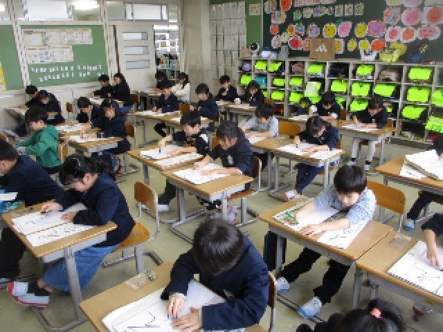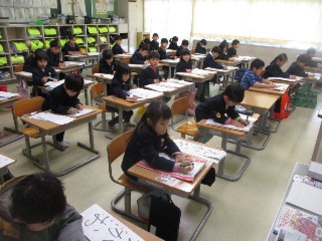 書き初め大会を行いました。子供たちは、冬休み中に練習した成果を存分に発揮しようと、集中して取り組みました。