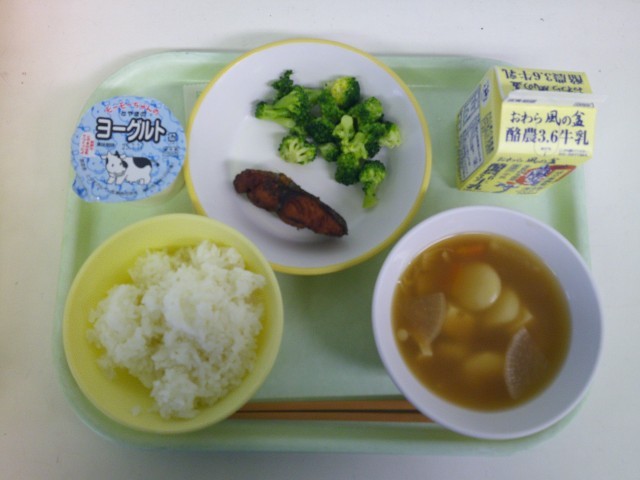今日の献立は、ごはん、シイラのえごまだれ、ゆでブロッコリー、すいとん、ヨーグルト、牛乳でした。