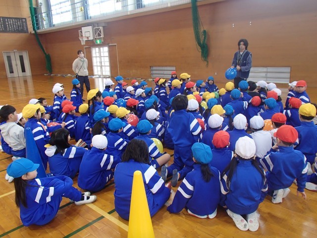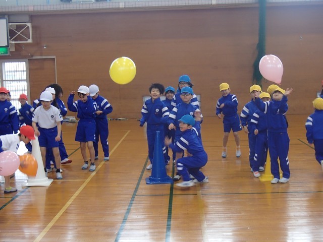 体育科「風せんバレー」の授業では、ふわふわと浮く風船を思い通りにつなぐにはどうしたらよいのかを考えています。「○○さん」「こっちだよ」など声をかけ合いながら運動に取り組んでいます。