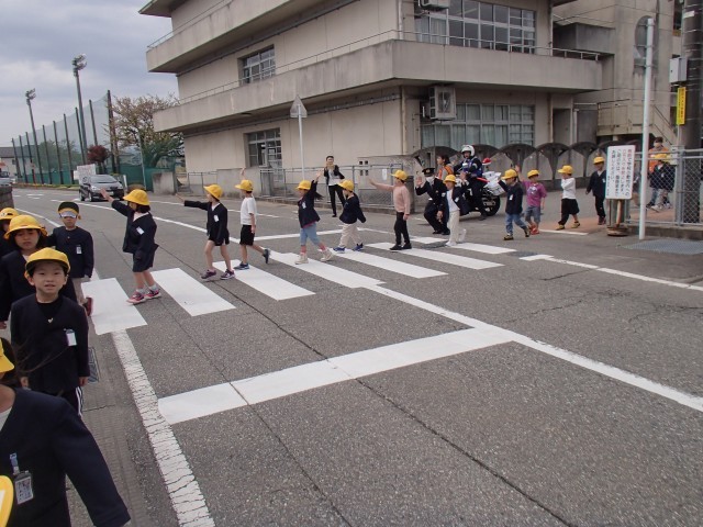 警察署の方から安全な歩行についてお話を聞いた後、実際に道路に出て練習をしました。子供たちは、教えていただいたことを守って横断歩道を渡ったり、道路を歩いたりしました。これから、自分の命を自分で守るために、約束を守って登下校しようという気持ちを高めていた子供たちでした。