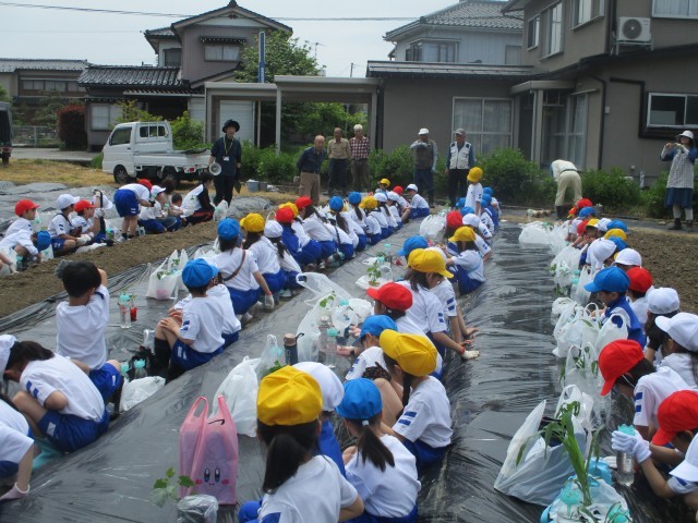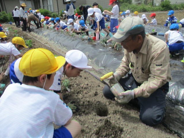子供たちは、栽培ボランティアの方が教えてくださる植え方のアドバイスを聞きながら、苗を植えました。「根っこのところの土をほぐすと、根っこが伸びやすくなるよ」と子供たちに話しておられて、「へぇ~!!!」と子供たちも先生も新しいことを学ぶことができました。