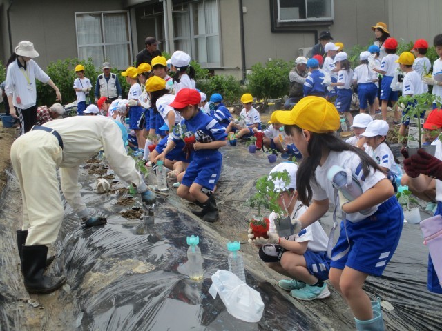子供たちは苗を植えながら、「元気に育ってね」「大きくなってね~」と話していました。実がなるようにこれからお世話していきましょう。
