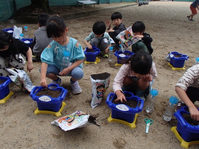 一人一人が「元気なアサガオになってほしいな」「きれいな花が咲いてほしいな」など、願いを込めて植えました。