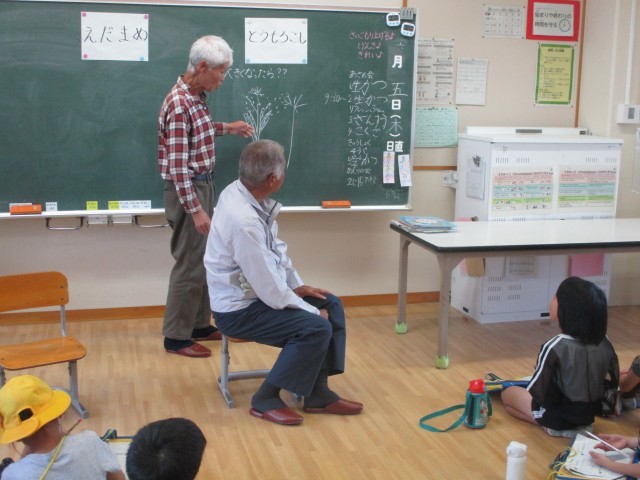 今日は、栽培ボランティアの方をお招きして野菜教室を実施しました。野菜ごとのグループに分かれて、今の野菜の生育状況をお伝えしたり、困っていることや聞いてみたいことを質問したりしました。絵を使って子供たちに分かりやすく説明してくださいました。