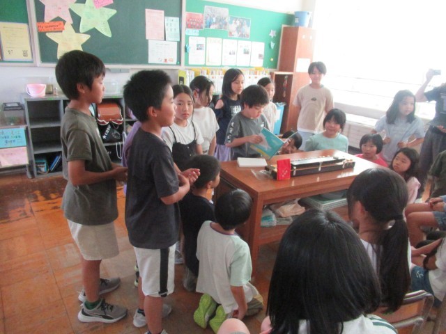 9月11日(水) 3年生 大正琴での交流 公開日 2025/09/11 更新日 2025/09/11 3年生 3年生の児童が、お家で大切にしている大正琴を全校のみんなに広めようと、ミート放送で呼びかけたり、他学年のクラスで紹介したりしています。今日は5年生のクラスで大正琴を紹介し、琴を弾く体験をしました。子供たちは、琴の様子や音色に興味をもって聞いていました。 3年生