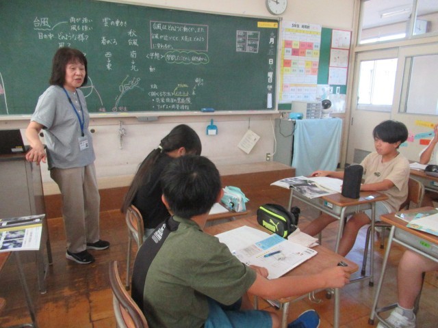台風についての学習が始まりました。今までの経験で知っていることや教科書の資料を基に、台風の威力や動き、台風によって天気がどのように変わるのかについて考えました。