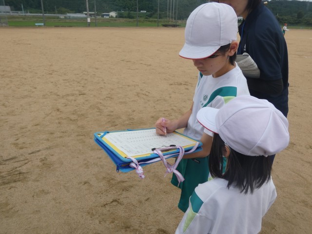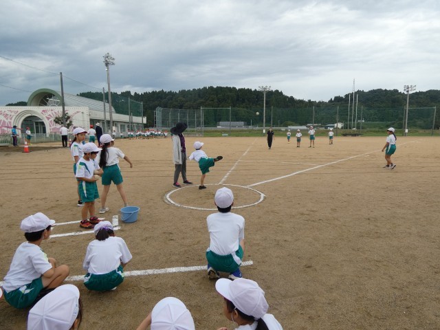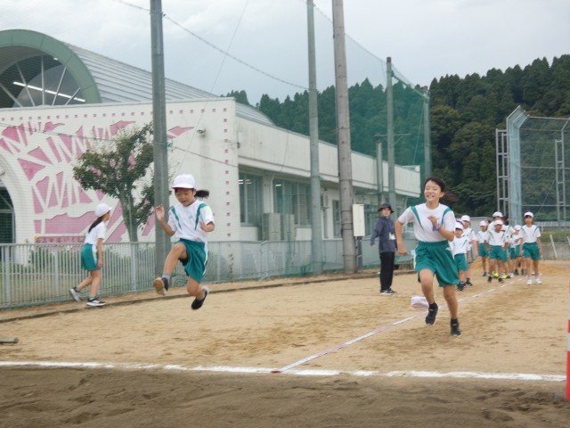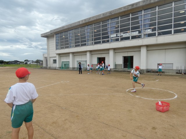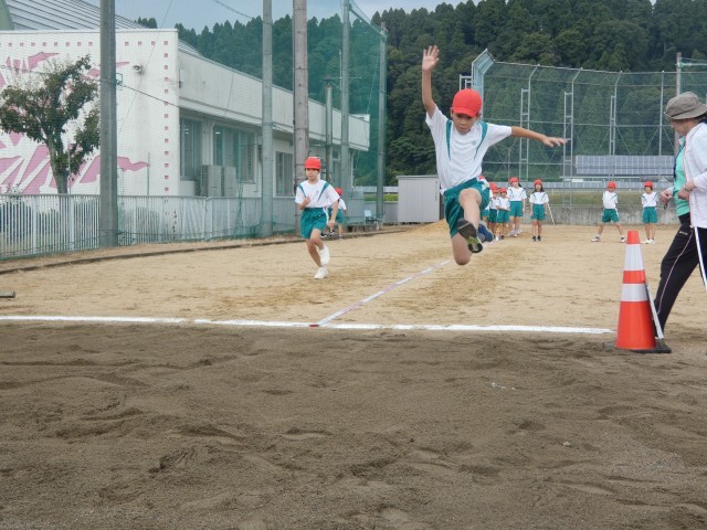 校内陸上記録会の様子です。走り幅跳びとソフトボール投げの2種目に挑戦しました。今までの練習の成果を発揮し、自分の目当ての記録に向かってがんばりました。なかよし班で記録したり、励まし合ったりしながら協力して取り組むことができました。