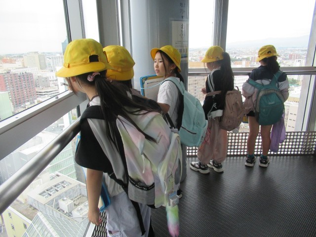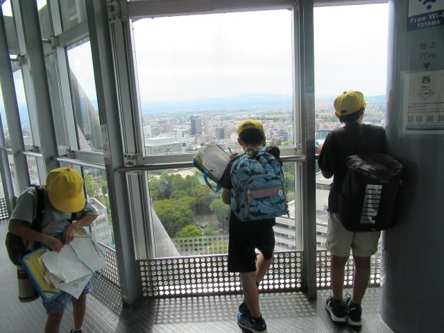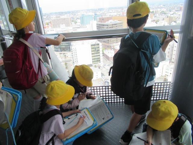10月3日(金) 3年生 校外学習 その3 公開日 2025/10/03 更新日 2025/10/03 3年生 午後は、富山市役所の展望塔を見学しました。子どもたちは、高い場所からの眺めを楽しんだり、それぞれの方角に見える様子をメモしたりしました。 帰りも路線バスに乗って、学校に戻りました。 3年生