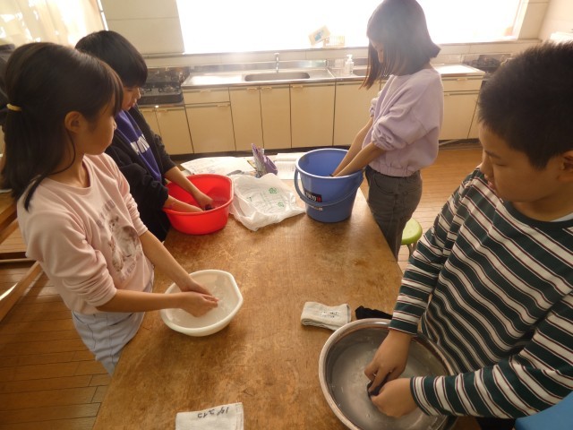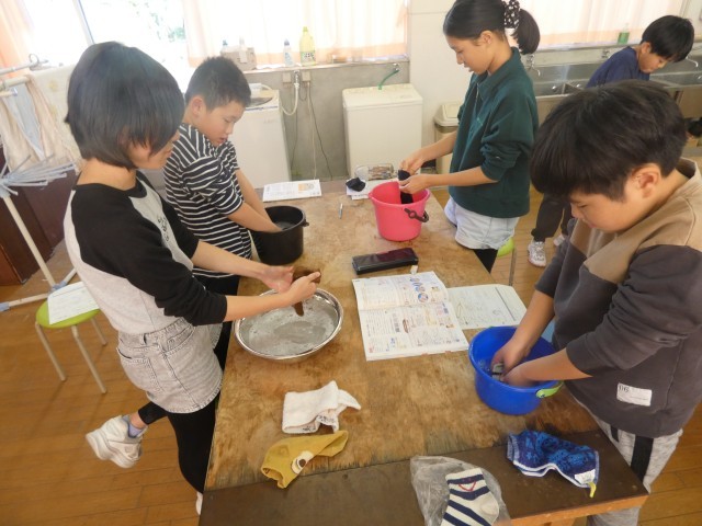 10月23日(木)6年生 家庭科 公開日 2025/10/23 更新日 2025/10/23 6年生 手洗いでくつ下を洗いました。水や洗剤の量を計算し、もみ洗いやつまみ洗いをして、汚れが落ちるようにがんばりました。 6年生