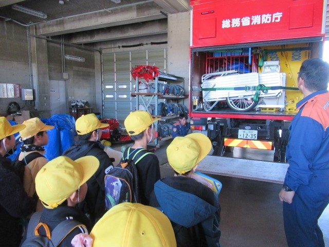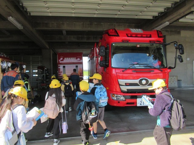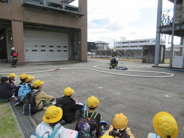 11月11日(火) 3年生 校外学習 その2 公開日 2025/11/11 更新日 2025/11/11 3年生 次に、富山市消防局婦中消防署を見学しました。普段見られない庁舎の中を見せていただいたり、署の方から詳しくお話を聞いたりしました。最後は、ホースを使った消火訓練の様子を見せていただきました。わたしたちのくらしを守るために、消防士の方が日々どのような思いで、訓練や出動をされているのかを知ることができました。 3年生