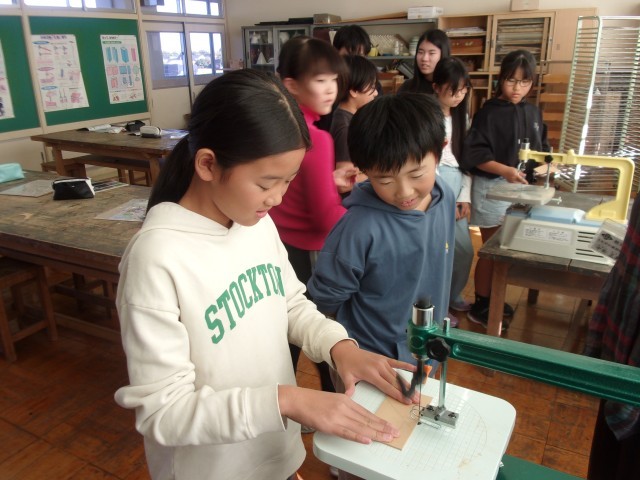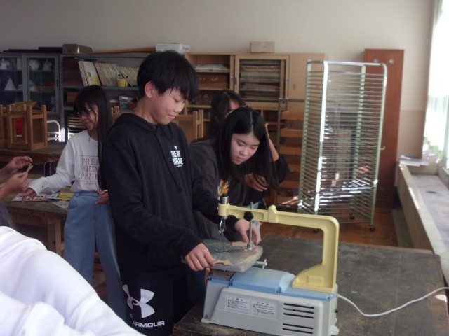 図画工作科の学習で、糸のこぎりを使った工作にチャレンジしています。刃の付け方や板の切り方を教わり、思い思いに板を切り進める中で、板を細かく動かして波模様ができるようになったり、直線や曲線を生かしながらできたパーツを組み合わせようとしたりしています。