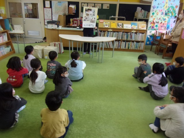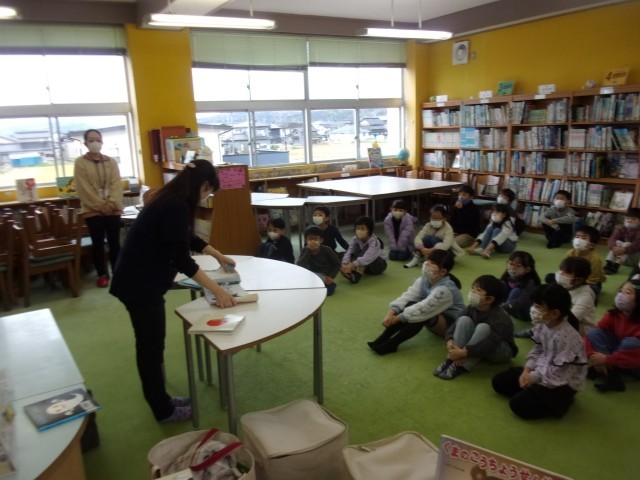 今日は、1、2年生で絵本の読み聞かせがありました。