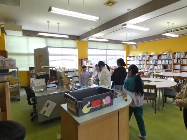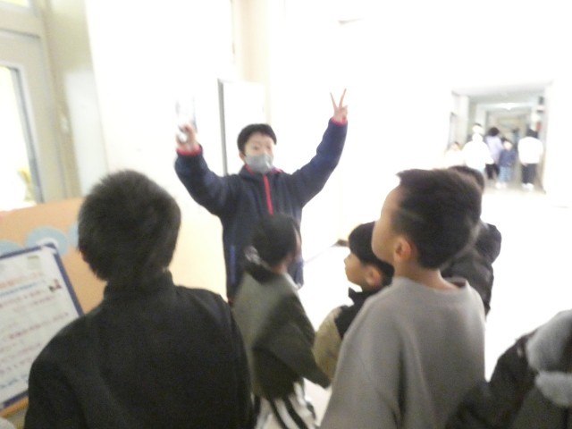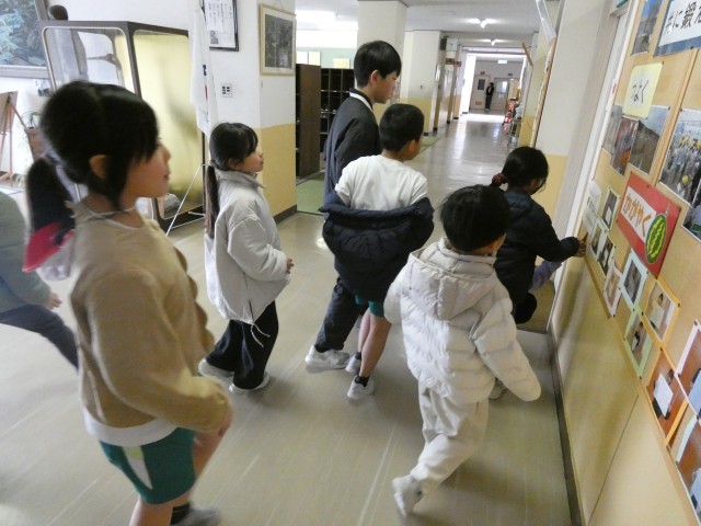 次に、あかるく委員会による図書室の新刊トレジャーハンティングゲームです。なかよし班で校舎内を回り、指定された新刊3冊の表紙のカードを探します。なかよし班で協力していろいろな場所を探していました。