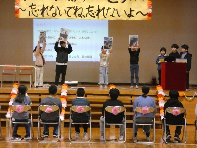 3年生は、6年間の思い出をクイズにしました。6年生が好きな朝日カルタの句や担任の先生の口癖など在校生には難問!?もあり、盛り上がりました。最後になかよし班で書いたメッセージカードを3年生がデコレーションをして、プレゼントしました。