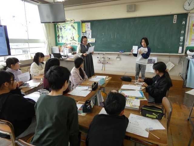 My heroの得意なことや性格など、似顔絵とともに英語で発表しました。ジェスチャーを付けたり、リアクションをしたり、一人一人のMy heroを伝え合うことができました。