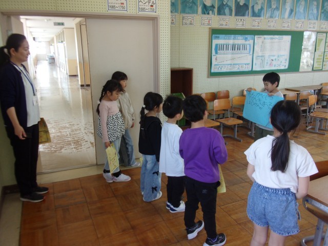 先週に準備していた「とある大作戦」は、入学したばかりの1年生に行った「学校案内大作戦」でした。子供たちは、1年生が楽しく学校を回れるように、各部屋で○✕クイズとシールラリーを取り入れて行いました。