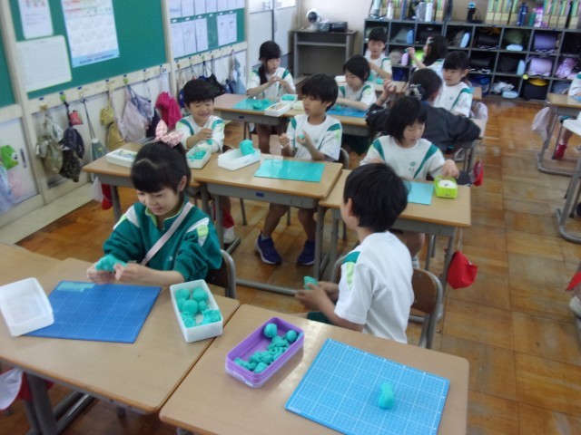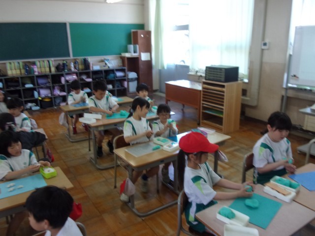 また、図画工作科「にぎにぎねん土」では、粘土を握ってできた形を見て、化石やフライドチキン、おにぎり等、様々な形を想像し、自分だけのオリジナルの世界観を表現しました。