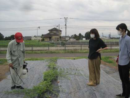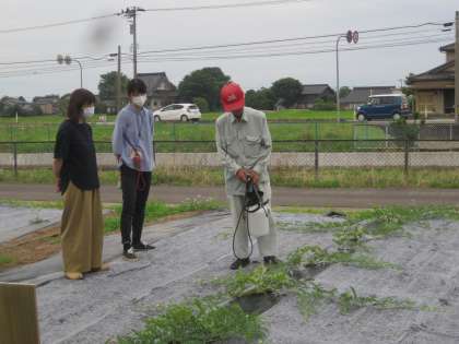 地域のスイカ名人さんに、なかよし班で育てているスイカが何者かに食べられてしまったことを相談したところ、夕方学校農園に来てくださいました。
