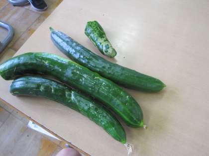 6月29日(火) 2年生 収穫の朝 公開日 2021/06/29 更新日 2021/06/29 2年生 1日収穫し忘れただけで、ものすごいスピードで野菜が成長しています。 大きな大きなキュウリを収穫しました。 ナスやキュウリがたくさん実っています。