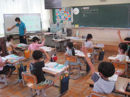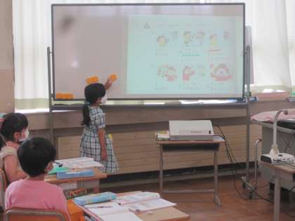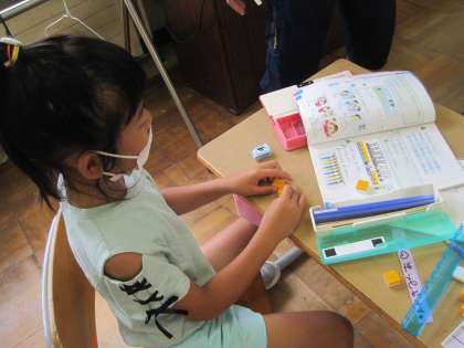 ブロックで体感しながら、言葉で思考過程を説明しています。