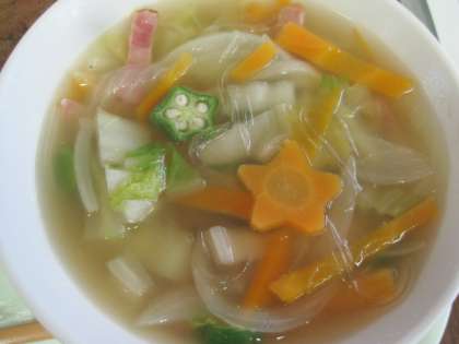 星がいっぱいです。天の川スープは、中にはるさめが入っていて、川の流れを表現しています。つるつるっとした食感がのどごしよく入っていきますね。天の川スープの中に星形人参が入っていた人はラッキー!
