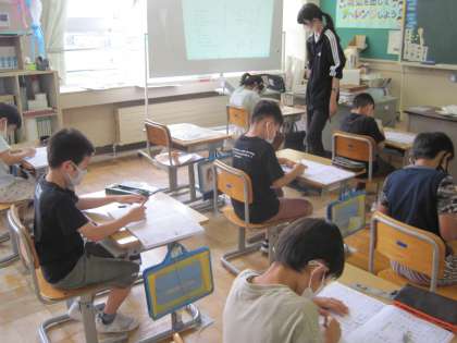 スイカ畑見学から戻り、今度は学習に集中しています。