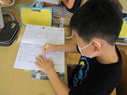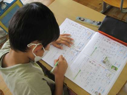 姿勢を整え、鉛筆の持ち方にも気を付けて、漢字練習をしています。