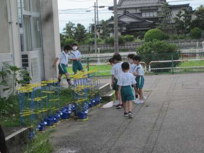 2年生は、学校農園で夏野菜を育て、教室横のガーデンでミニトマトを育てています。