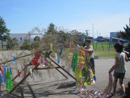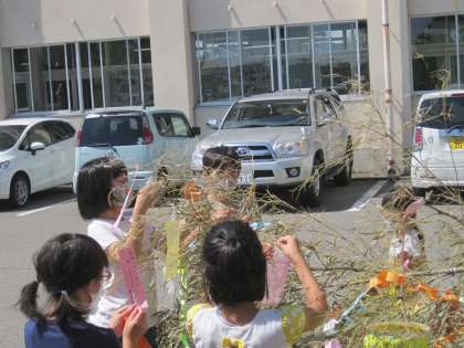 7月1日(木) 5年生 七夕かざり 公開日 2021/07/01 更新日 2021/07/01 5年生 短冊に願いを込めて、笹竹に結び付けました。 みんなで協力して吹き流しや提灯などの七夕かざりをつけて、七夕の笹が華やかになりました。