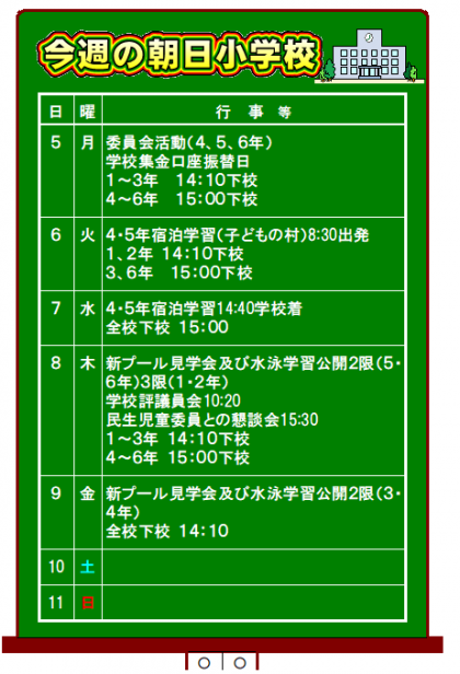 今週は、4・5年生の宿泊学習があります。自分たちで考えて行動したり、友達と協力して活動したりして、成長する子供たちの姿を期待しています。