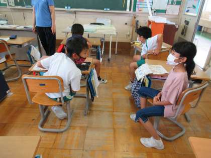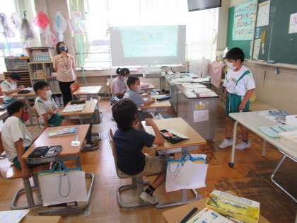 7月6日(火) 外国語活動 I like ○○ 公開日 2021/07/06 更新日 2021/07/06 3年生 好きな食べ物や色、スポーツを英語で伝え合いました。 「好きな物をたくさん言いたいな」 「まだみんなが知らないことを言いたいな」 など、みんなに聞いてもらいたいことを考えて 全員が友達の前で発表しました。