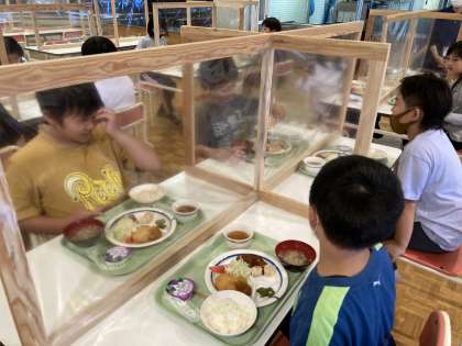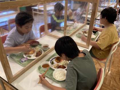 7月6日(火) 4、5年生 宿泊学習 夕食タイム その2 公開日 2021/07/06 更新日 2021/07/06 5年生 メニューは、コロッケ、鳥の唐揚げ、しゅうまい、酢豚、漬物、ごはん、味噌汁、ゼリーです。みんなモリモリ食べています。