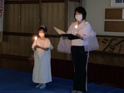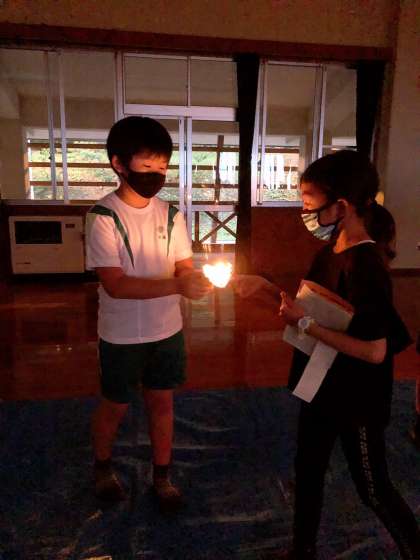 7月6日(火) 4、5年生 宿泊学習 キャンドルサービス その1 公開日 2021/07/06 更新日 2021/07/06 5年生 火の女神、営火長、火の子が入場しました。 火の女神から営火長に火が捧げられました。 営火長からお言葉をいただきました。 営火長から火の子へ、協力の火、元気の火、安全の火が捧げられました。その火は一人一人に手渡されました。